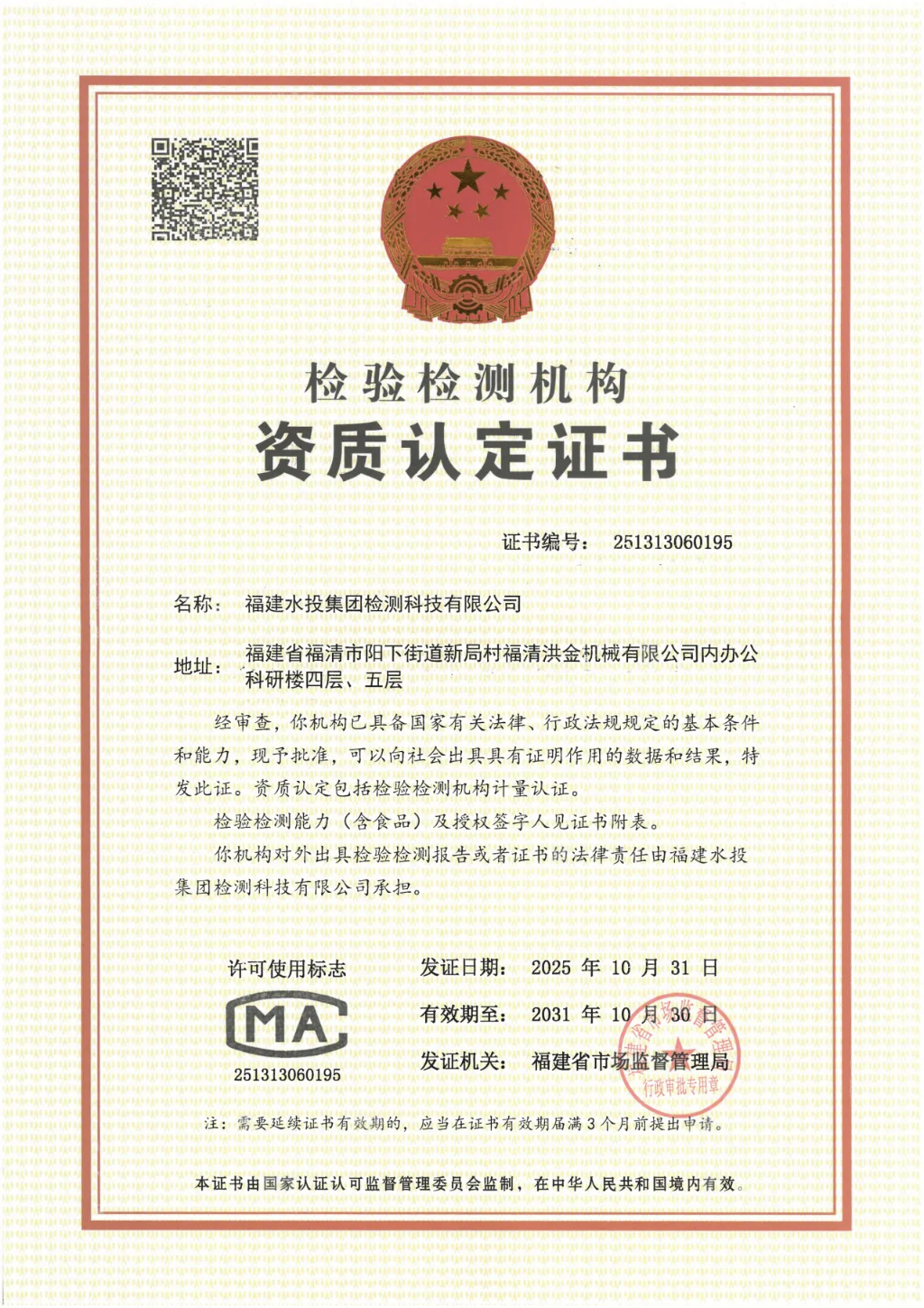 近日,福建水投集團檢測科技有限公司順利通過水質(zhì)指標檢測能力CMA資質(zhì)認證,涵蓋生活飲用水、水和廢水2大類74個項目,...